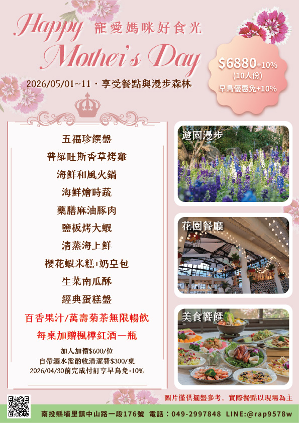 今年母親節,我們為您準備的不再只是一頓飯,而是一場身心靈的放鬆之旅。 位於南投埔里的純淨空間,您可以先在繁花盛開的園區中悠閒散步
