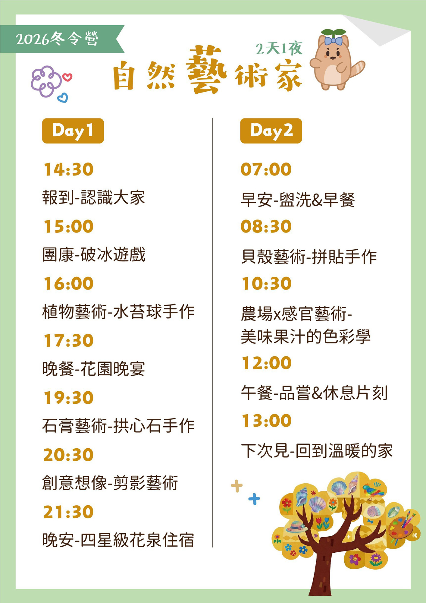 07:00 早安-盥洗&早餐 08:30 貝殼藝術手作 果汁的顏色與味道(可可、草莓、藍莓) 12:00 美味午餐品嘗時間 13:00 回到溫暖的家 |